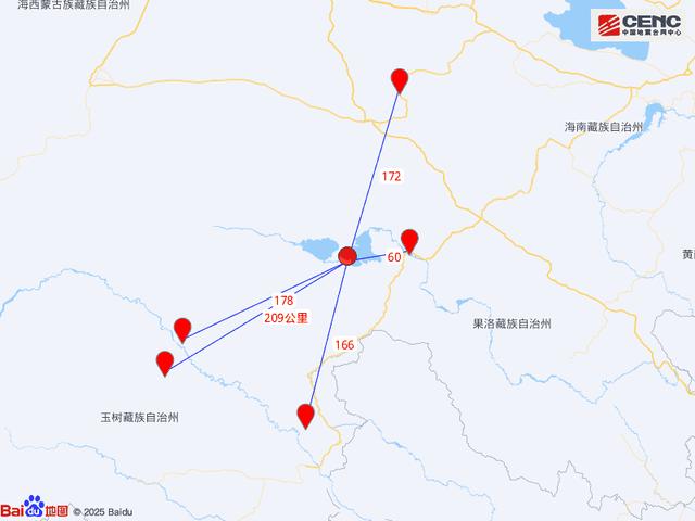 震中距玛多县60公里、距称多县166公里、距都兰县172公里、距曲麻莱县178公里、距治多县209公里,距玉树藏族自治州210公里,距果洛藏族自治州249公里,距西宁市431公里。