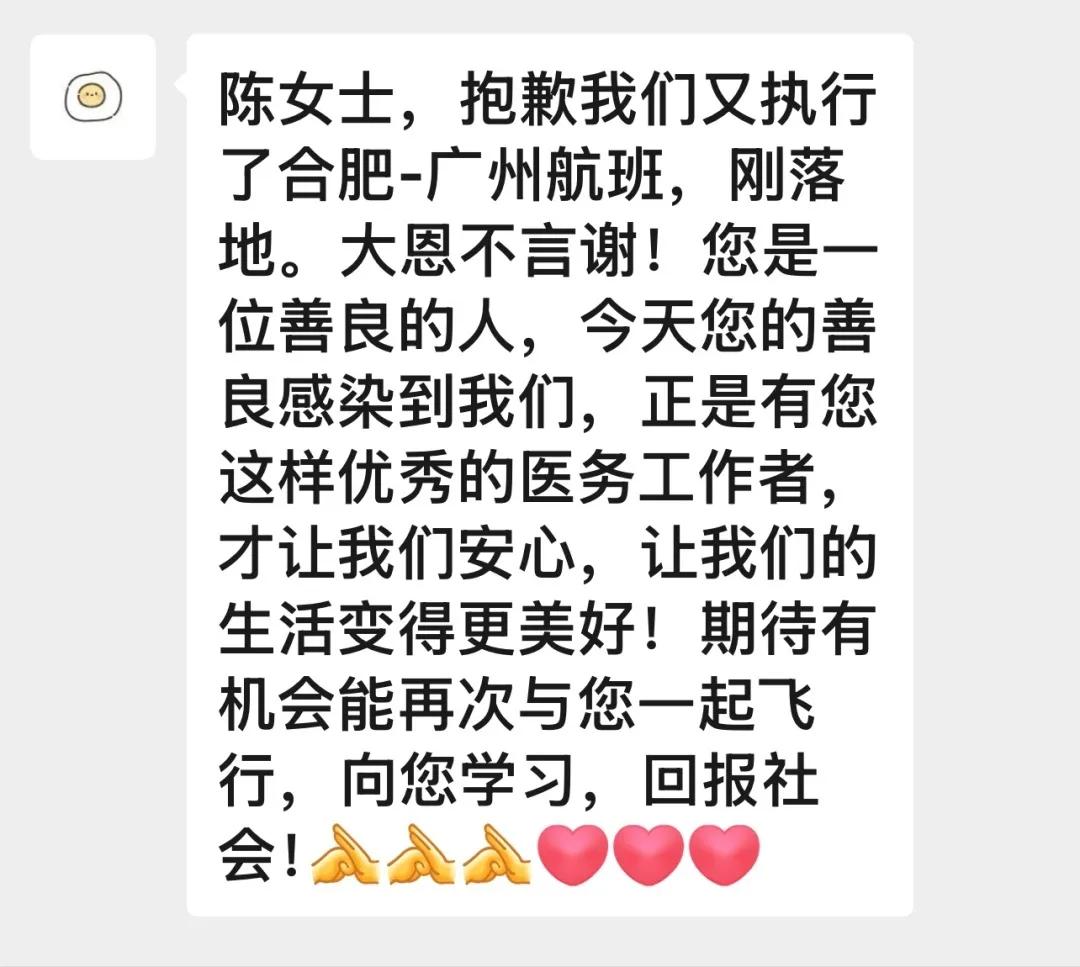 “今天您的善良感染了我们,正是有您这样优秀的医务工作者,才让我们安心,让我们的生活变得更美好!期待有机会能再和您一起飞行,向您学习,回报社会!”
