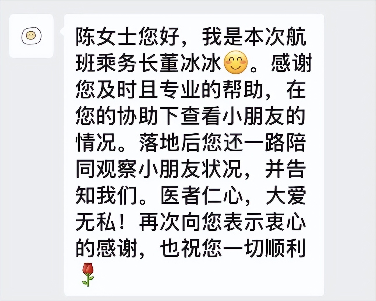 “感谢您及时且专业的帮助,在您的协助下查看小朋友的情况。落地后您还一路陪同观察小朋友状况,并告知我们。医者仁心,大爱无私!再次向您表示衷心的感谢,也祝您一切顺利!”