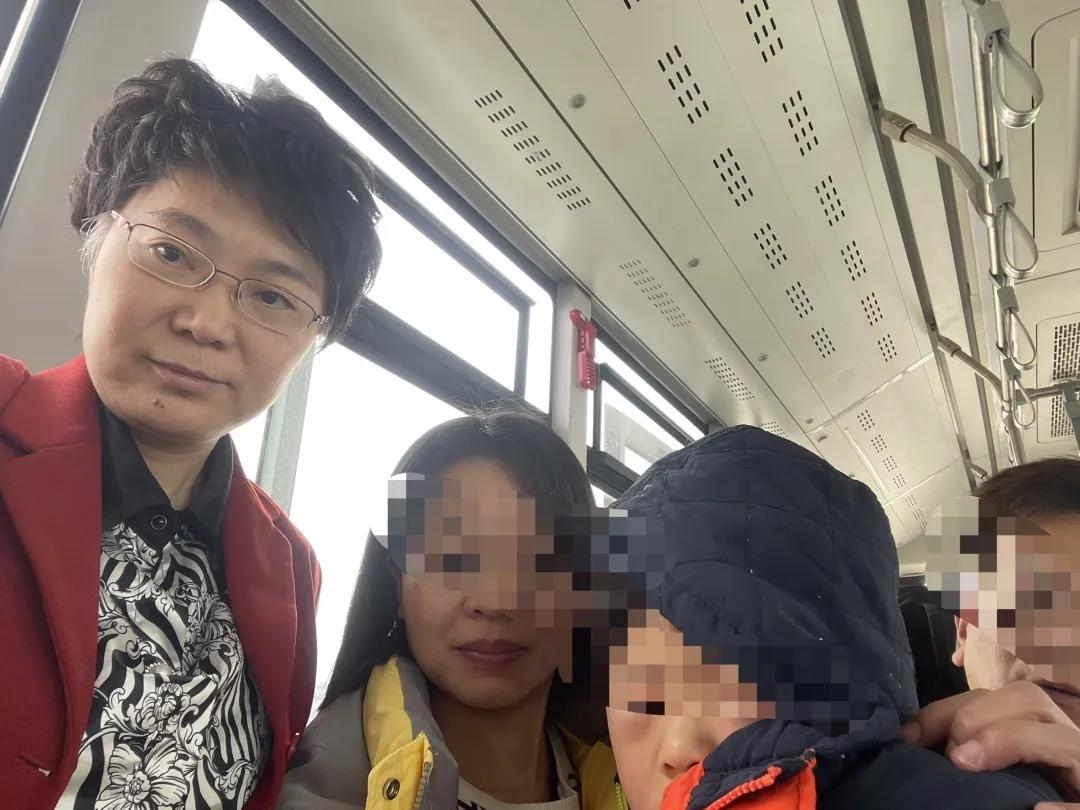 在摆渡车上,男孩症状已经缓解。一家三口和陈秀华合影致谢。