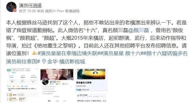 1月8日下午,演员任逍遥在其个人社交账号发文,称“颜十六”真名颜某磊,曾用名“颜俊枫”“颜君超”“颜超”。2015年左右来到横店,当过群演、武行,后来做动作指导和导演,拍过《绝地重生之黎明》等作品。据任逍遥的表述,目前此人还在其他招聘平台发布招聘信息。据了解,一个月前,“颜十六”曾邀请朋友前往泰国拍戏称“能多挣钱”,并曾以《缉毒女警》剧组招募演员的名义,在各类演员交流群中发布消息。