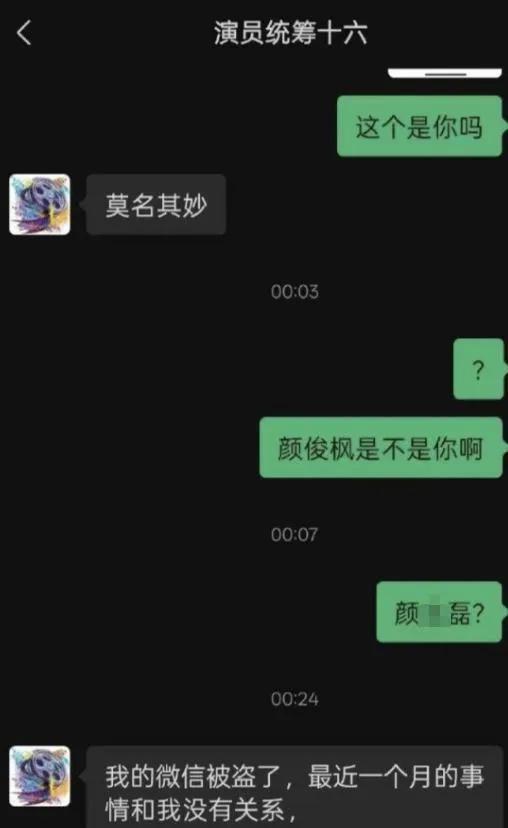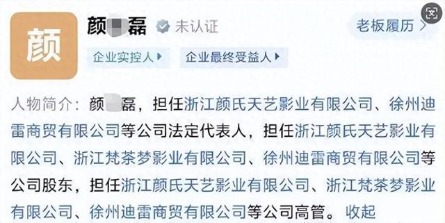 天眼查信息显示,目前颜某磊关联企业共有4家,除了浙江颜氏天艺影业有限公司仍存续状态外,徐州迪雷商贸有限公司、北京大洋此岸影视文化传媒有限公司处于吊销状态,浙江梵茶梦影业有限公司已注销。另据网上流传出的聊天截图内容显示,演员统筹“颜十六”曾辩称自己“微信号被盗了,最近一个月的事情和我没关系”。