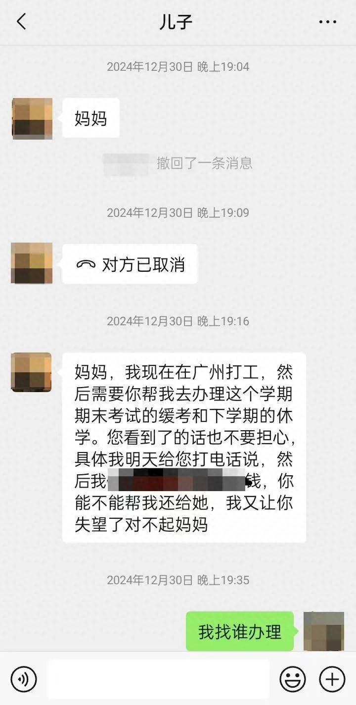 小军(化名)出生于2003年,是湖南科技大学大三学生。2024年12月30日,妈妈曹女士突然接到小军的信息,说是自己要去广州打工,让家人帮助办理缓考和休学手续。“他期末考试还没考,而且就算要打工,也应该在假期才去。当时,孩子手机关机了,微信也不回,我们觉得不对劲就去学校找他。”曹女士调取了相关公共视频画面,这才发现2024年12月25日下午1点45分,小军背着一个书包坐车离开学校,之后就再也没回来。