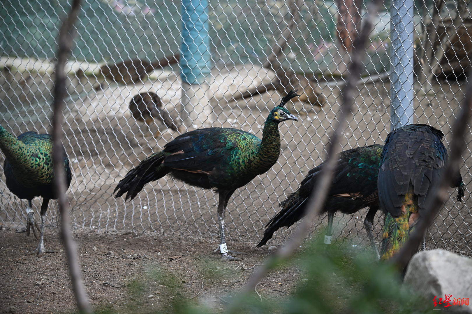 值得一看的还有新成员绿孔雀,它的冠羽长短不一,呈簇状,眼周蓝色,脸颊上有大块黄色皮肤,颈部羽毛为绿色,呈鱼鳞状。谈及绿孔雀与蓝孔雀的区别,饲养员介绍,蓝孔雀较为常见,又叫印度孔雀,来自南亚,“蓝孔雀的冠羽长短一样,像一把散开的小扇子,其颈部羽毛为宝蓝色,呈丝状。”