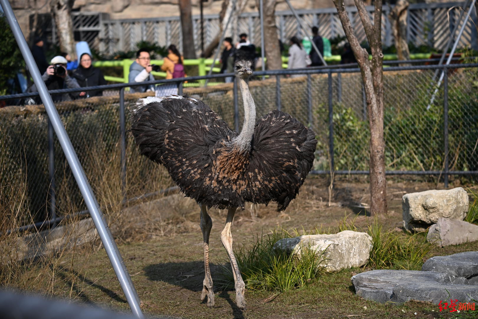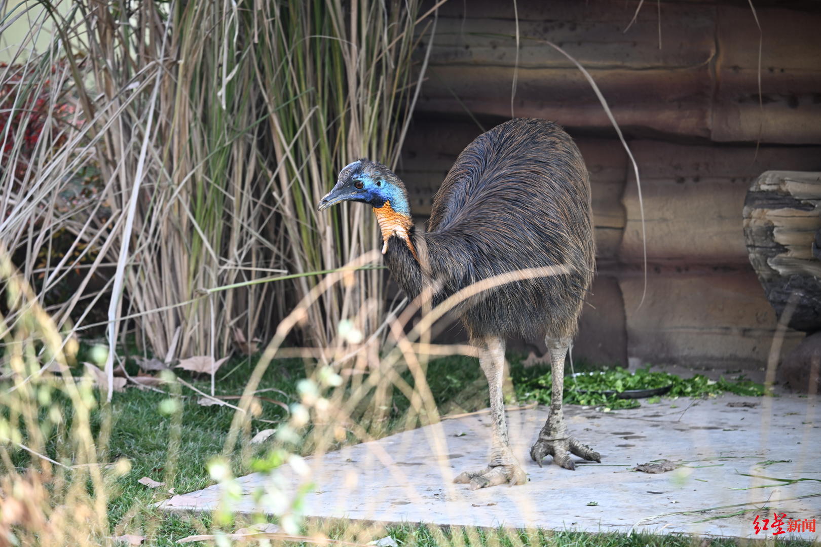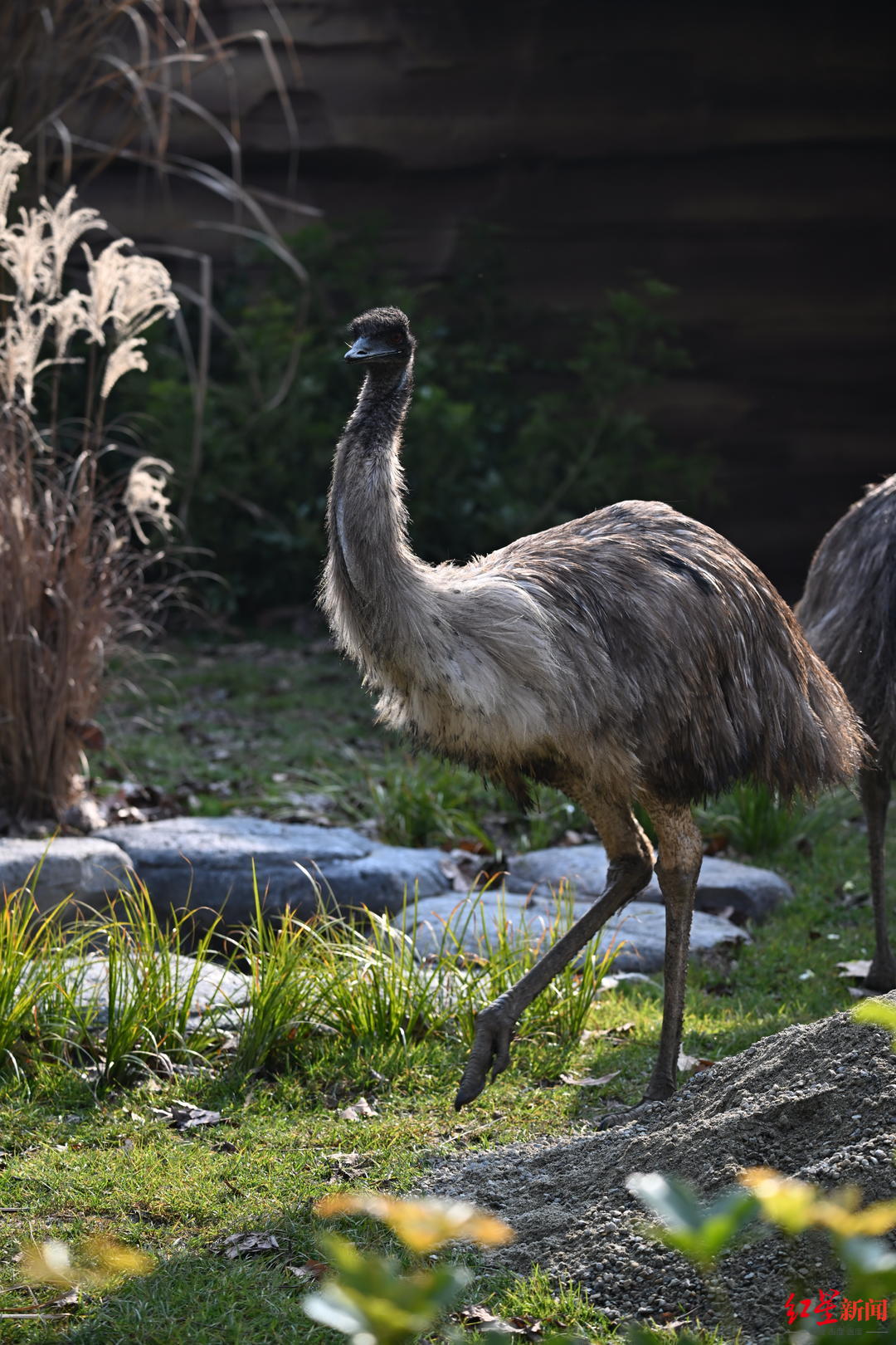 紧邻小熊猫馆的,是新成员鹤鸵、鸵鸟和老朋友鸸鹋的居所。鹤鸵就像身披黑白相间华服的“森林贵族”,以其独特的红色肉垂和修长的双腿,还有神奇的头冠,吸引着游客的目光。而鸸鹋与鸵鸟这对“陆地巨鸟”组合,外形上虽然相似,但是仔细观察,两者间的差异还是显而易见的。