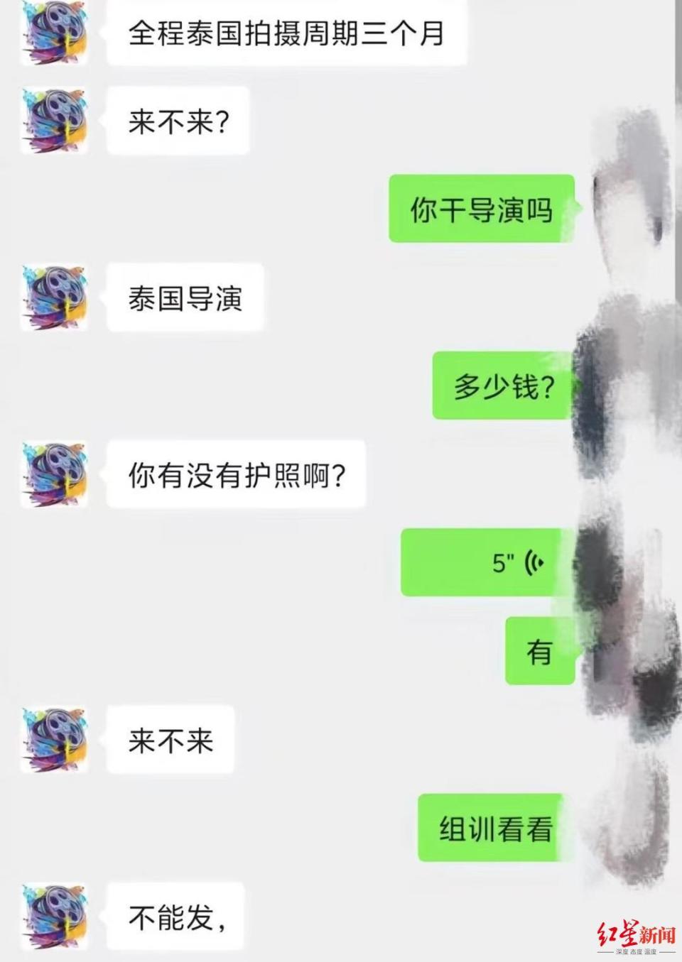 另一名接到“颜十六”拍戏邀约的演员介绍,2024年12月7日,“颜十六”曾邀请他到泰国拍戏,周期同样是3个月。在其询问对方是否为招募剧组的导演时,对方称是“泰国导演”。此后,当他咨询组讯情况时,“颜十六”声称“不能发,和军方有关”。最后,该演员因心存怀疑,拒绝了“颜十六”的邀约。