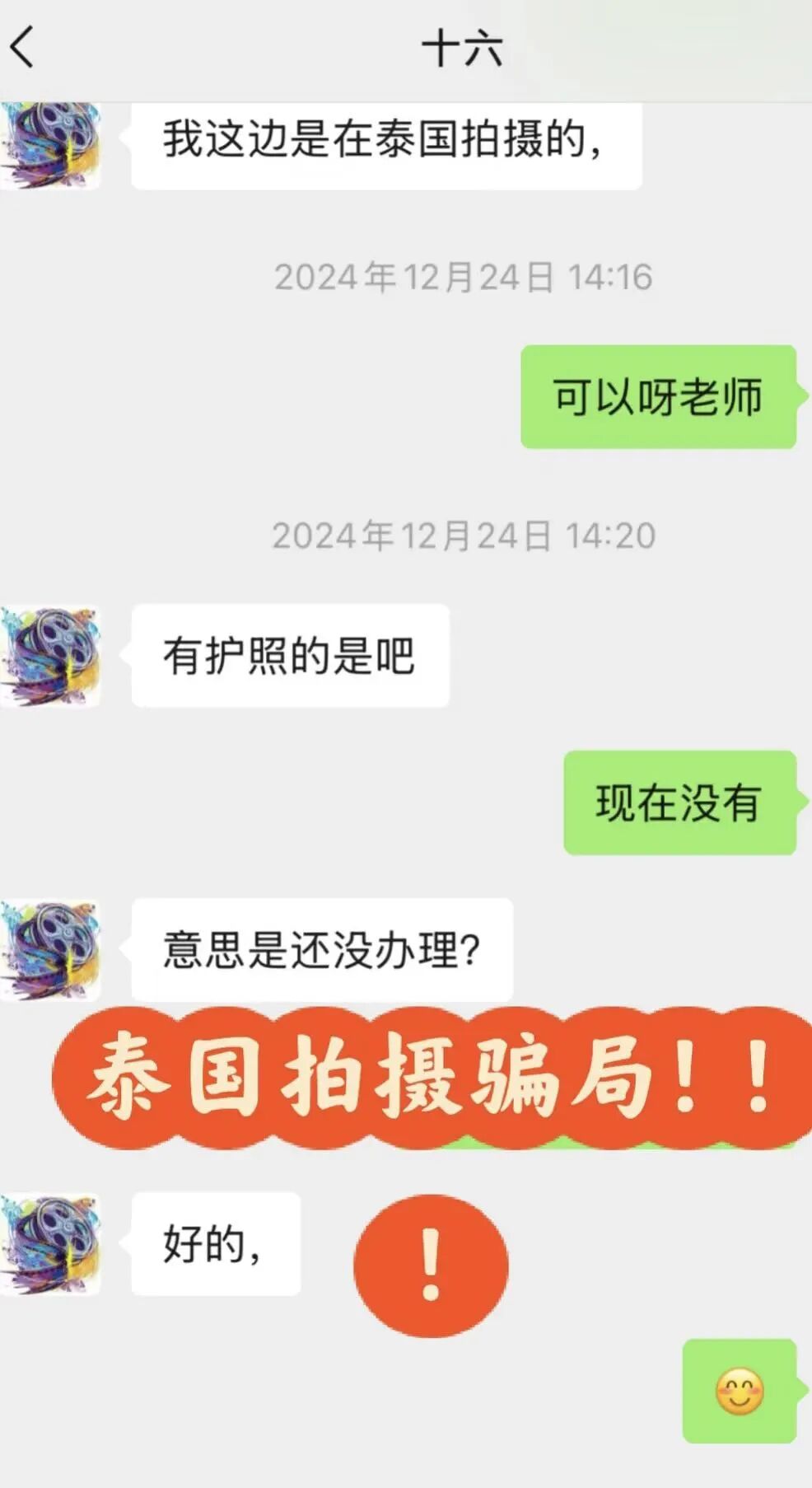 12月26日,颜十六再次催促七七发送护照回执单,当确认七七已经办理护照流程后,对方便回应可以继续等待。但当七七详细问及拍摄信息及地址时,颜十六只含糊回答说“这个角色拍14天”、“轻喜剧”、“2号开机”、“曼谷周边拍摄,住宿在市区”。