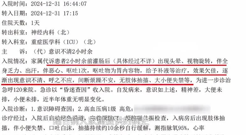 “她在网上买了一些灌肠的东西,自己在家操作,灌完肠后又喝了很多水”,不久后,大姨出现了头晕、恶心、呕吐的症状,意识模糊。