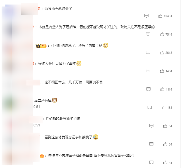 在此话题下,不少网友说送车时涨粉是被福利吸引,抽完后取消关注也很正常,后面还会掉。