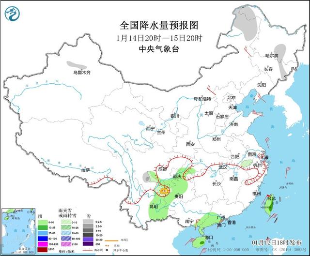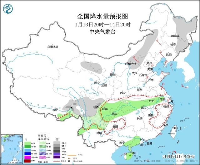 图1 全国降水量预报图(1月12日20时-13日20时)