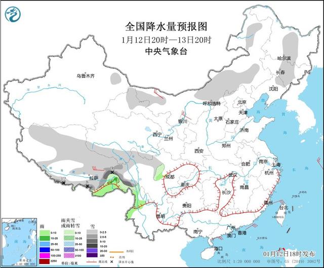 1月12日20时至13日20时,内蒙古西部和中部、黑龙江中部、吉林中部、西藏大部、青海南部、川西高原中北部等地部分地区有小雪或雨夹雪,其中,西藏东部和南部部分地区有中到大雪,局地暴雪(10~12毫米)。西藏东南部、云南西部等地部分地区有小雨,其中,西藏东南部部分地区有中雨。内蒙古西部、甘肃西北部、西藏中东部、川西高原等地部分地区有4~6级风;东海北部、南海大部海域将有6~8级、阵风9级的大风,南海西南部部分海域风力可达9级、阵风10级(见图1)。