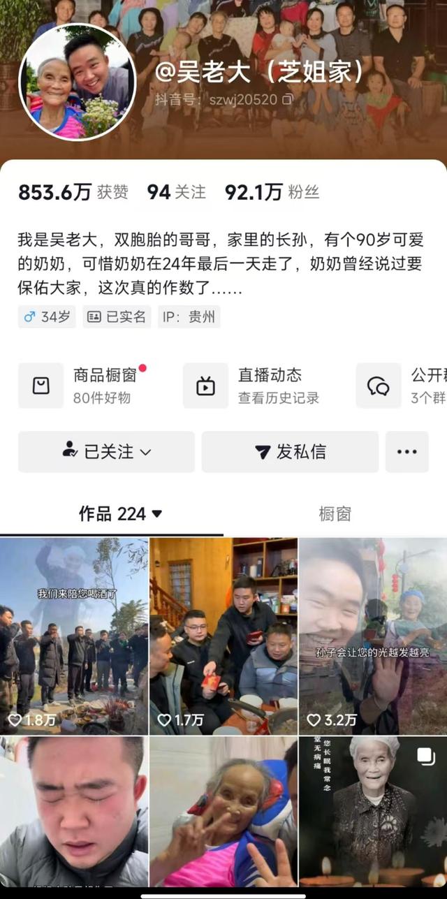 “‘别回去嘛,这里这么多人喜欢你。’‘谁喜欢我?’我就拿着手机一边给她念一边解释,有多少播放量、点赞是给她的,大家在评论里说‘好喜欢’‘好可爱’的。”吴老大向红星新闻记者回忆道,奶奶一下子就很高兴了,就觉得“好像自己的一生又找到事情做了”。