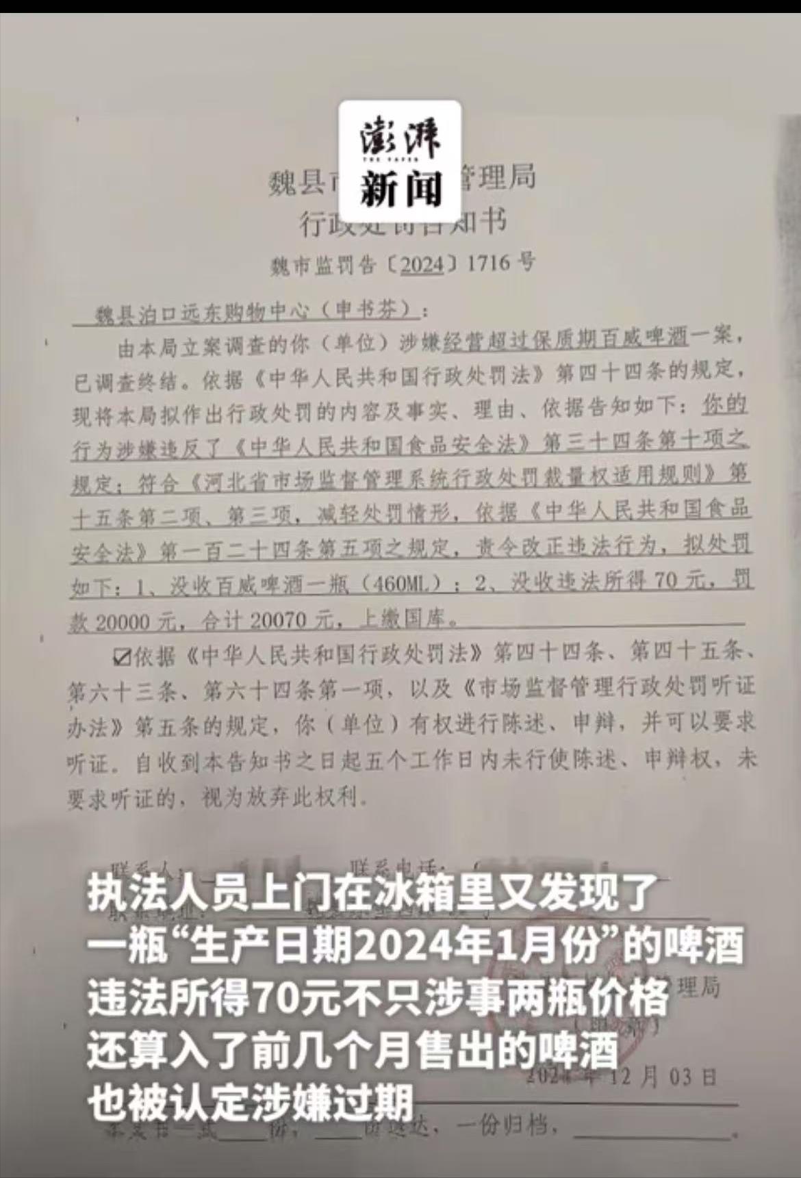 据澎湃新闻报道,邯郸市民申书芬反映,其经营的超市莫名出现两瓶过期啤酒,市监部门作出“没收一瓶、罚款两万”的处罚。魏县市场监管局人员表示,已召开听证,将沟通决定结果。