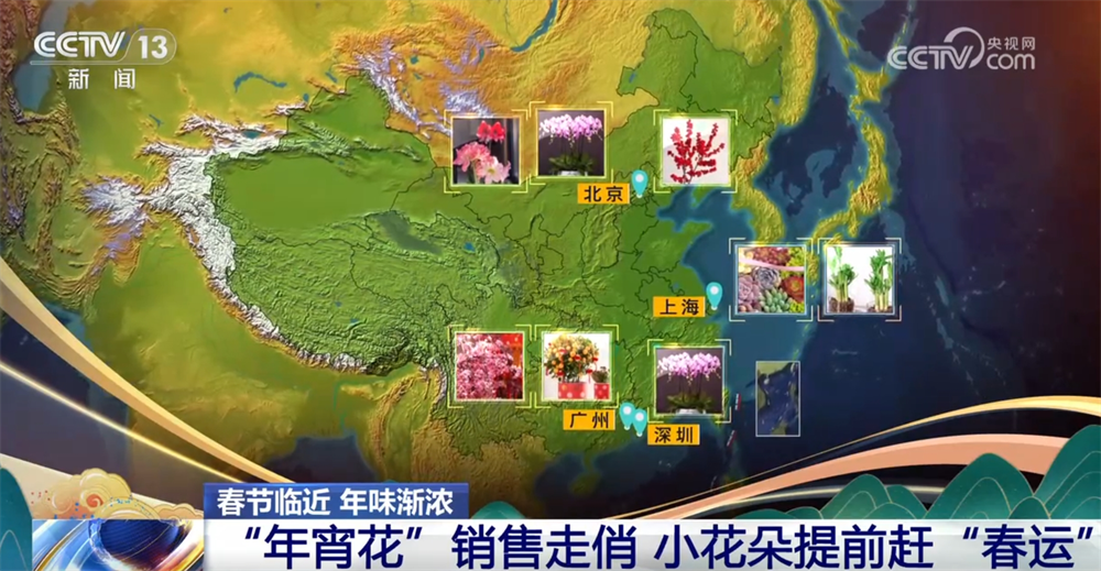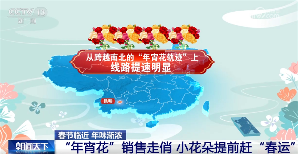 央视网消息:春节临近,花卉迎来销售旺季。数据显示,各地早早就进入“年宵花”预热期。南花北运,小花朵的“春运”也开始了,我们今天用地图的方式来看看年宵花的运输和销售路径。