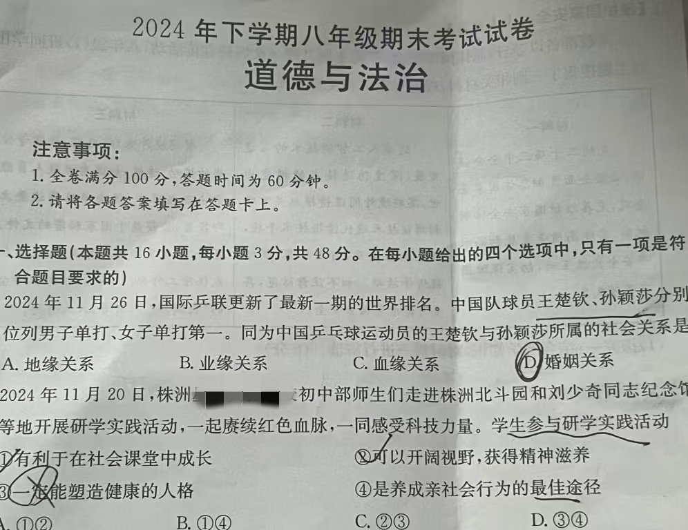 正值期末考试季,日前,陆续有网友晒出中小学生的试卷题目,表示“做题时碰到了孙颖莎”。其中,有一位湖南网友晒出一份八年级期末考试《道德与法治》科目的试卷,这份试卷上的第一道题,就与王楚钦和孙颖莎有关。