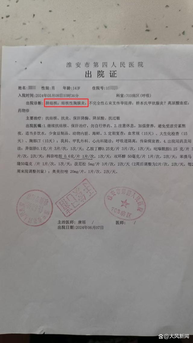 “县级医院对肺结核这种传染疾病的治疗条件有限,我们就5月8日把孩子转到上一级医院住院治疗。”陆先生介绍,经淮安市第四人民医院专家诊断,孩子不仅得上了肺结核,而且肺部多发疾病,已经产生了不可逆的病变。