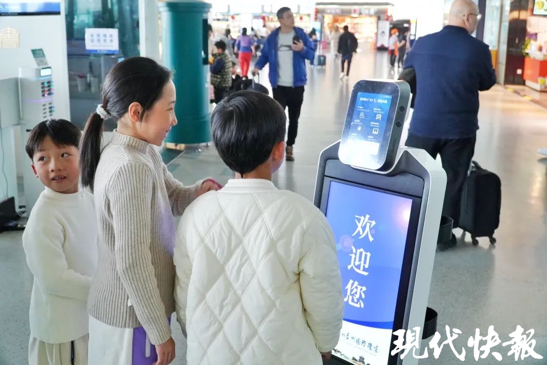 在航站楼大厅,机场还放置了实体服务机器人“小飞”,以航站楼候机厅为服务场景,承担内场流动问讯、指引、登机口维序等多项职能,不仅能告知旅客航班情况、天气状况等基础信息,还能移动指引旅客前往各项设施,与旅客互动送上新春祝福。