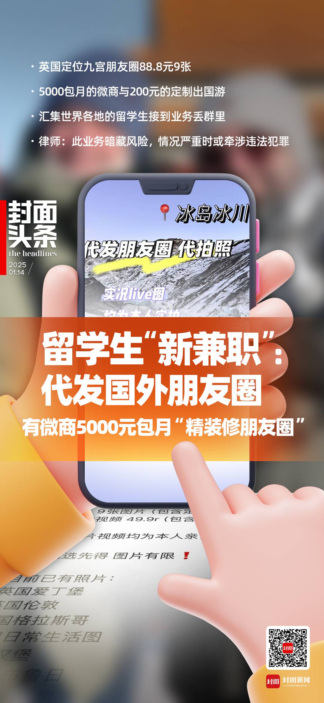 “伴随寒假来临,代发朋友圈的人开始多起来。”在纽约做小语种教学兼职的月忻现在已经组建了全世界留学生群,有代发朋友圈的业务会在群里沟通。在她的客户中,有社交平台上做得“风生水起”的大网红,也有5000元包月的微商大哥。如今定位全球,只发不游的“定制游”朋友圈仅需200元,深得老顾客的喜欢。但喧嚣之余,上百点赞的背后,这些困囿于虚荣定位中的人,除了未曾体验所展示过的真实生活外,在他们不曾注意到的角落里,还蕴藏极高的法律风险。