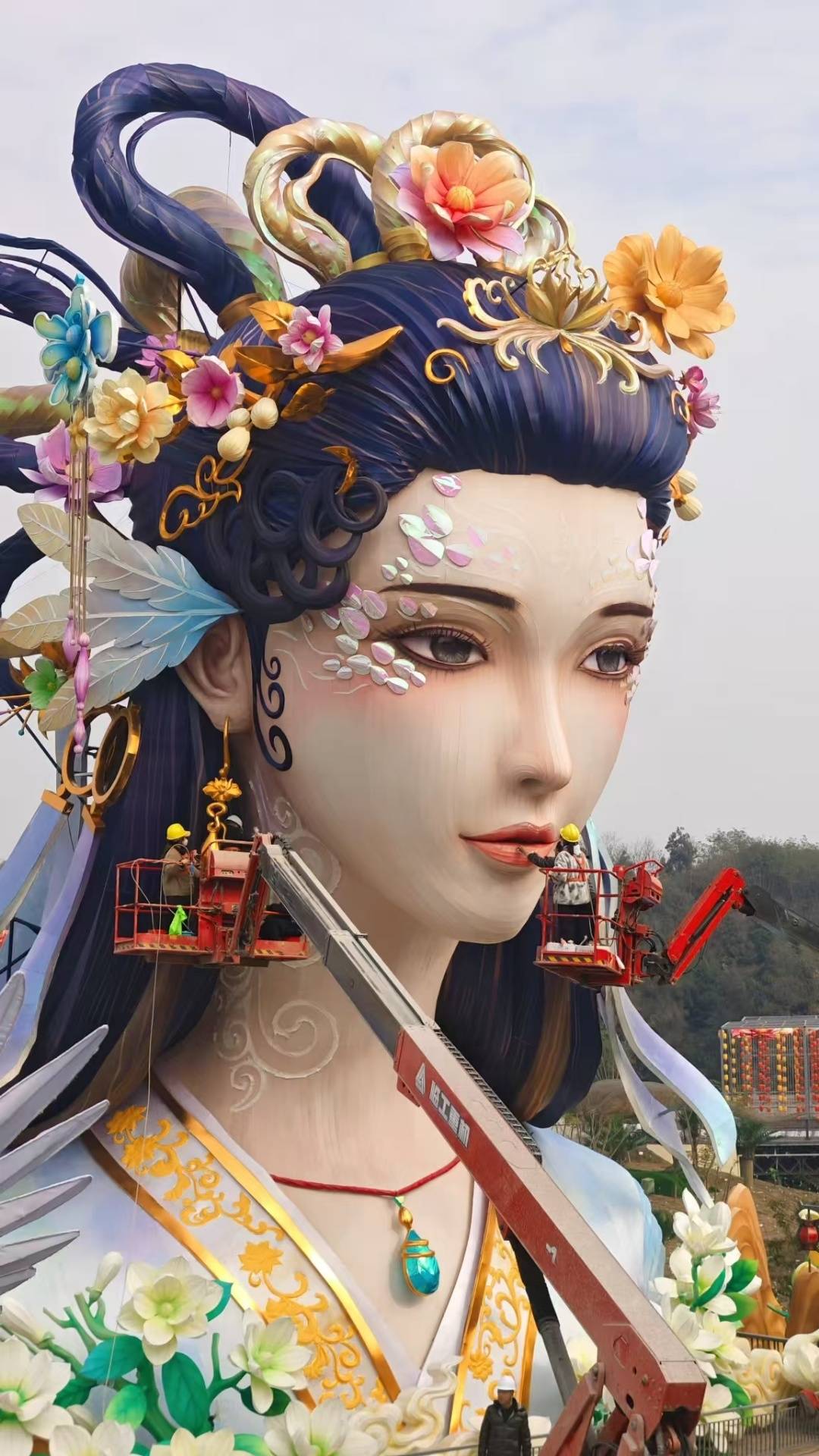 前期设计就花了一个多月,设计图画了四、五稿,搜集整理的妆容照就有700余组,既要符合东方美学,也要照顾大众审美。“先要手绘图稿,然后电脑制图。在造型阶段,造型运用3D打印模具参考,整体造型还是自贡灯会的传统工艺——丝架造型,七、八十人的团队紧锣密鼓地工作了两个多月。造型除了借鉴先进技术,更多还是要靠工匠的手艺、经验和责任心。但目前,灯组还是半成品,妆容和灯光都还在调试。”