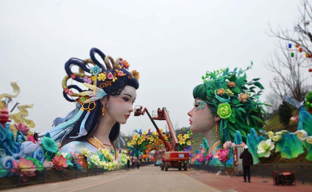 远远望去,白娘子与小青两两相望,人物造型逼真、优雅,夜晚亮灯后,动态的观赏效果会更佳。《青城双姝》想要表达什么样的场景?
