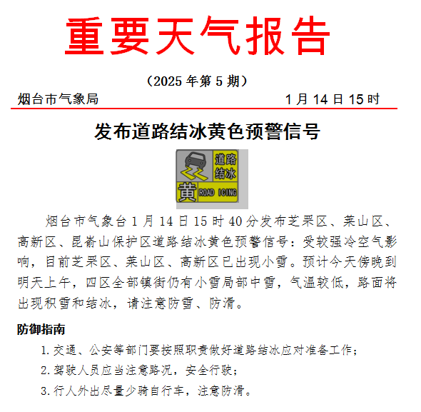 从烟台市气象台获悉,1月14日15时40分,市气象台发布芝罘区、莱山区、高新区、昆嵛山保护区道路结冰黄色预警信号:受较强冷空气影响,目前芝罘区、莱山区、高新区已出现小雪。预计14日傍晚到15日上午,四区全部镇街仍有小雪局部中雪,气温较低,路面将出现积雪和结冰,请注意防雪、防滑。
