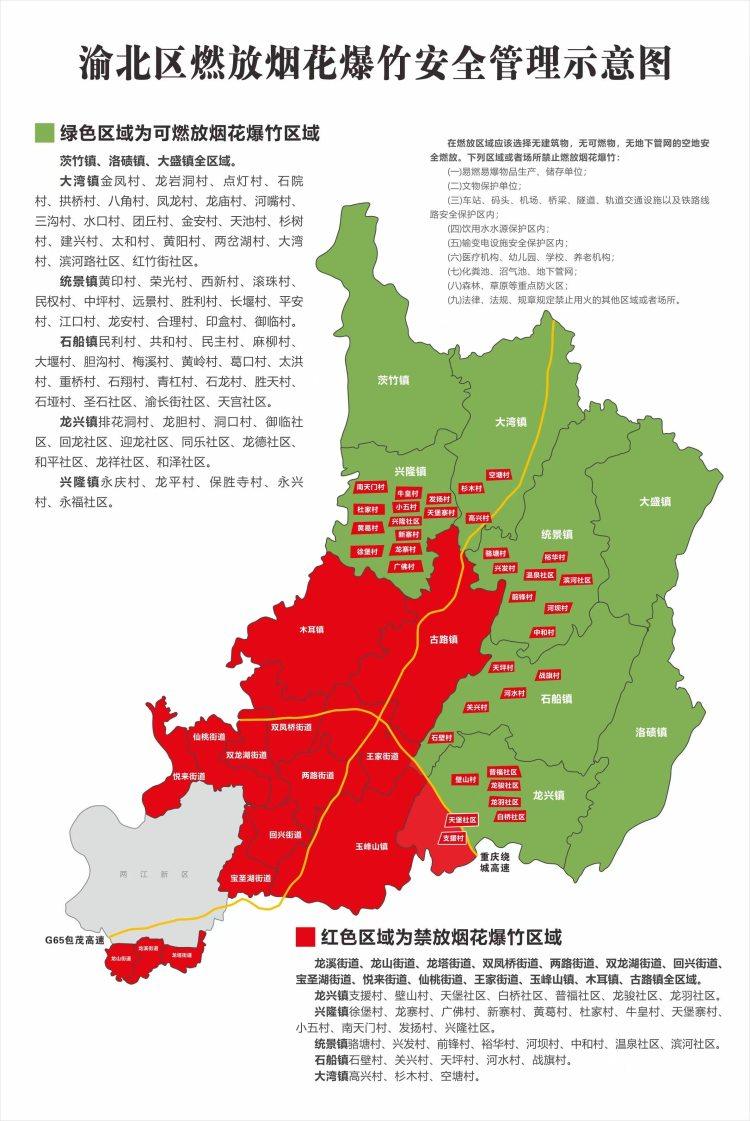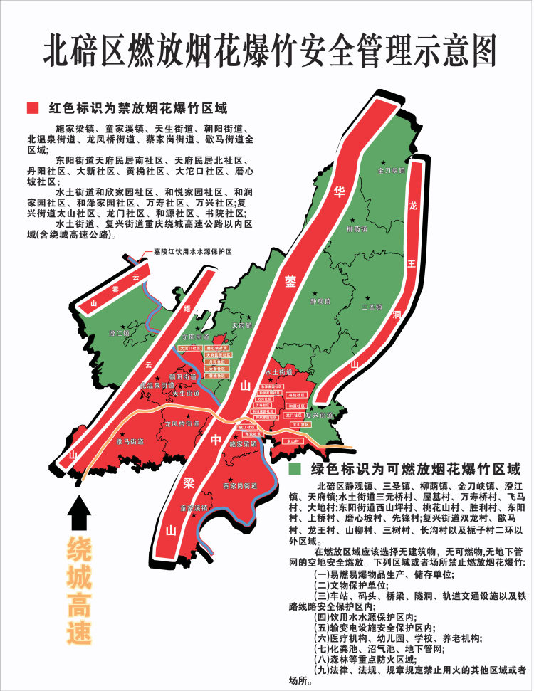 据介绍,2025年重庆中心城区可以燃放烟花爆竹的区域主要集中在北碚区、渝北区、巴南区。具体区域为北碚区的静观镇、三圣镇、柳荫镇、金刀峡镇、澄江镇、天府镇,水土街道的三元桥村、屋基村、万寿桥村、飞马村、大地村,东阳街道的西山坪村、桃花山村、胜利村、东阳村、上桥村、磨心坡村、先锋村,复兴街道的双龙村、歇马村、龙王村、山柳村、三树村、长沟村以及栀子村二环以外区域。