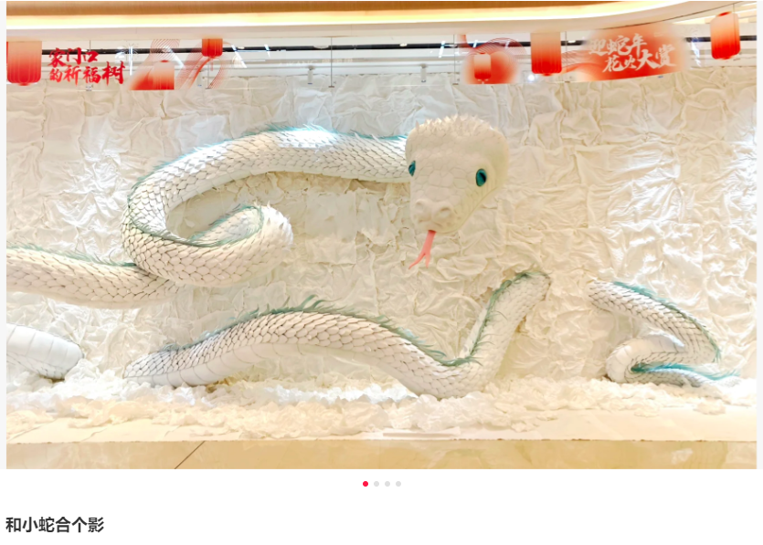 芙蓉天街这条蛇算是最逼真的了,吐着红信子的白蛇占据了整面墙,蛇身鳞片清晰可见,动作逼真,仿佛正破墙而出,据现场展板介绍,这是巨型白蛇纸艺展。