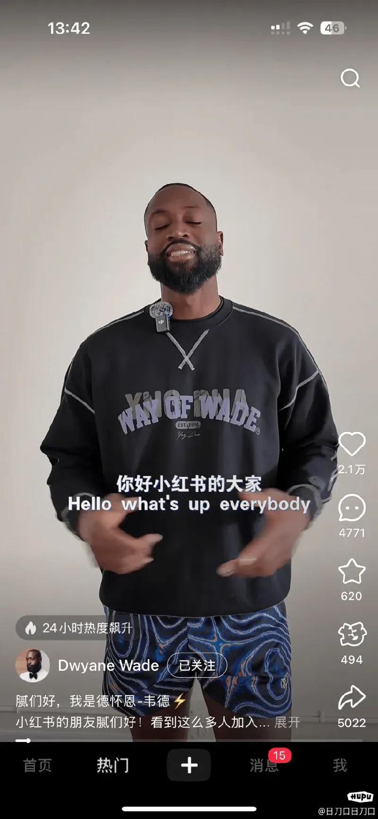 15 日,据现代快报,NBA 传奇球星韦德也在小红书上开设账号,并发布视频用中文说 " 你好 ",请求中国网友点个关注。