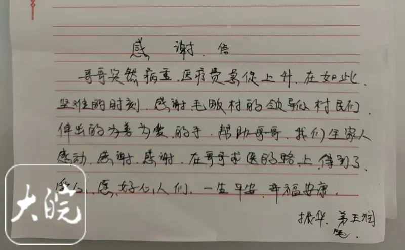王润还写下了一封感谢信,感谢毛畈村村民在这个艰难时刻,向哥哥伸出了为爱为善的手,帮助哥哥。感动,感谢,感恩!