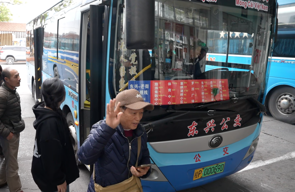 早上8点多,在东兴市旅游集散中心门口,一辆张贴着中越两种语言标识的公交车格外引人注目,乘客正排队登上这辆跨国公交。售票员一一检查乘客的证件,有的是护照,有的是边民证。
