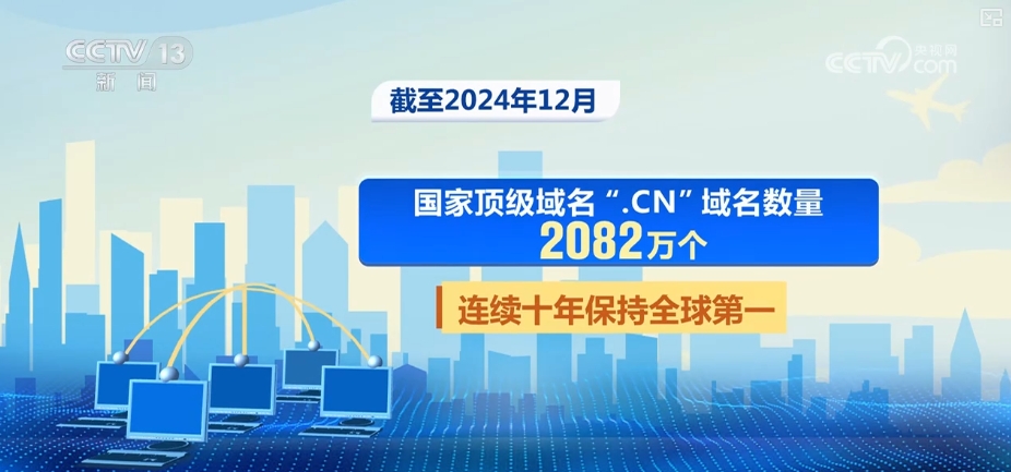 截至2024年12月,国家顶级域名“.CN”域名数量达2082万个,连续十年保持全球第一。
