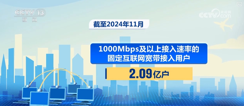 截至2024年11月,全国已累计建成5G基站达419.1万个,比上年末净增81.5万个;1000Mbps及以上接入速率的固定互联网宽带接入用户达2.09亿户。人、机、物泛在智联有序推进,为更多用户接入互联网服务提供坚实支撑。