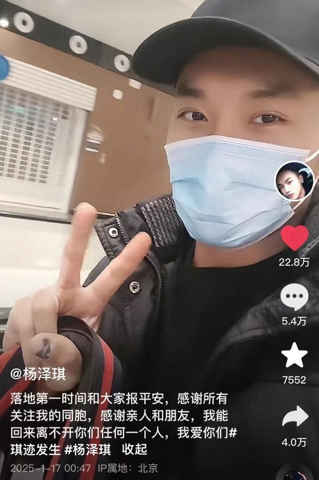 1月17日上午,杨泽琪表姐告诉红星新闻,杨泽琪还没有跟亲属取得联系,在短视频平台看到杨泽琪发布落地国内的信息,亲属才确认他已归国。