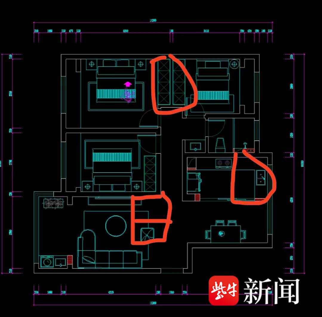 姜女士告诉记者,她于2019年在南通市海门区一小区购买了一处房产,总面积110平方米,得房率约80平方米。今年9月,因家里小孩着急上学,他们一家人搬来新家居住。2024年10月底,她发现厨房水管漏水,有一大片水渍,“我多方打听,发现楼上的业主常年不在,将房子委托二房东出租,还把厨房做了卫生间,客厅做了2个卫生间,主卧本该是衣柜的位置也做了卫生间,加上原本自带的一个,楼上一共有5个卫生间。”