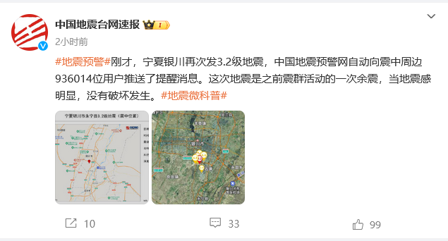 宁夏银川再次发3.2级地震,中国地震预警网自动向震中周边936014位用户推送了提醒消息。这次地震是之前震群活动的一次余震,当地震感明显,没有破坏发生。