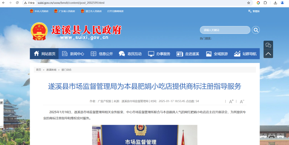 17日,遂溪县市场监督管理局就此事公开发文回应称,1月16日,遂溪县市场监督管理局工作人员已与肥娟小吃店店主召开座谈会,为其提供了专业的商标注册指导和维权应对服务。