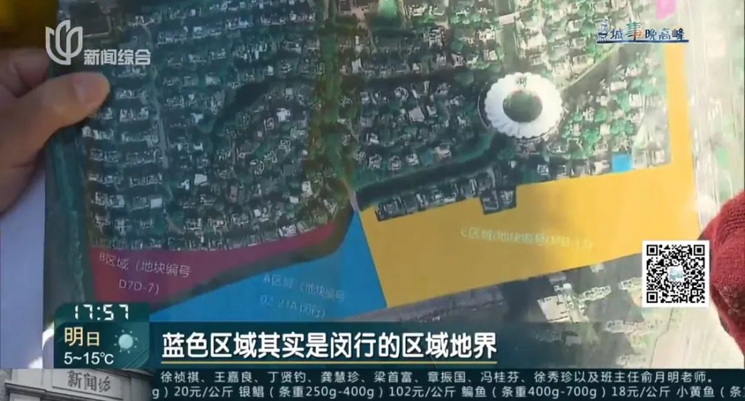 陈先生梅陇镇某小区居民:蓝色区域其实是闵行的区域地界,这个也是我们和闵行城规局人员做沟通过明确的,红色和黄色和紫色区域是徐汇区的公共绿地。
