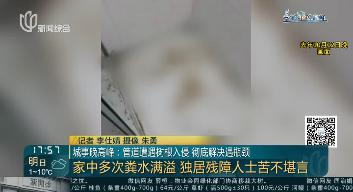 严女士向记者展示的三次反水时的视频,分别拍摄于去年9月、10月以及上周六(1月11日),由于严女士的妹妹是聋哑人,视网膜也有损伤,等她发现反水时,家中早已是污水横流、粪便满溢。