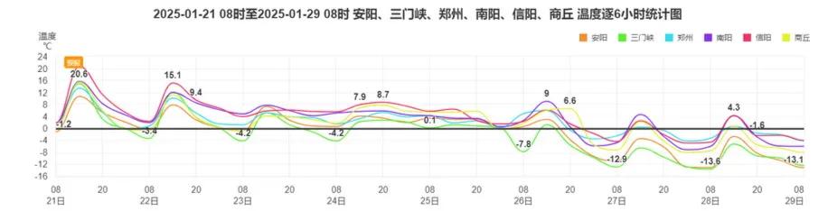 1月21日8时-29日8时河南省代表站逐6小时气温预报