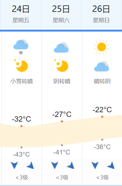 预计阿勒泰地区河谷、平原最低气温将降至-27℃~-30℃,沿山一带降至-30℃~-35℃,山区降至-35℃~-39℃,布尔津县禾木乡降至-44℃左右,富蕴县吐尔洪乡降至-43℃左右。