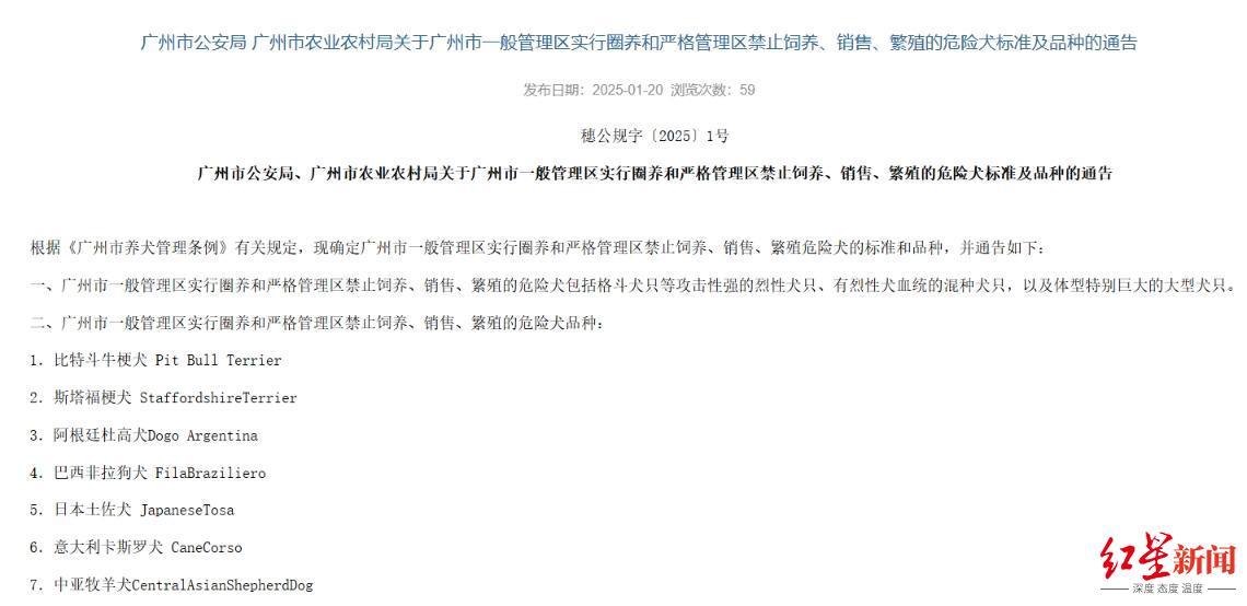 1月20日,《广州市公安局、广州市农业农村局关于广州市一般管理区实行圈养和严格管理区禁止饲养、销售、繁殖的危险犬标准及品种的通告》发布,将中华田园犬(土狗)移出危险犬种类名录。该通告自2025年1月21日起施行,有效期5年。