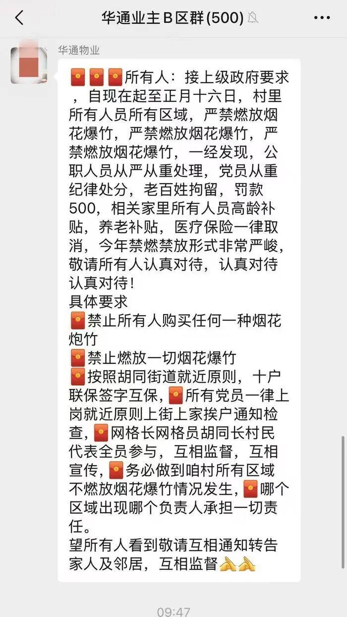 网传聊天截图显示,在一个名为“华通业主B区群”的聊天群内,有名为“华通物业”的人员在群里发出通知称:接上级政府要求,自现在起至正月十六日,村里所有人员所有区域,严禁燃放烟花爆竹......一经发现,相关家里所有人员高龄补贴、养老补贴、医疗保险一律取消......按照胡同街道就近原则,十户联保签字互保等。