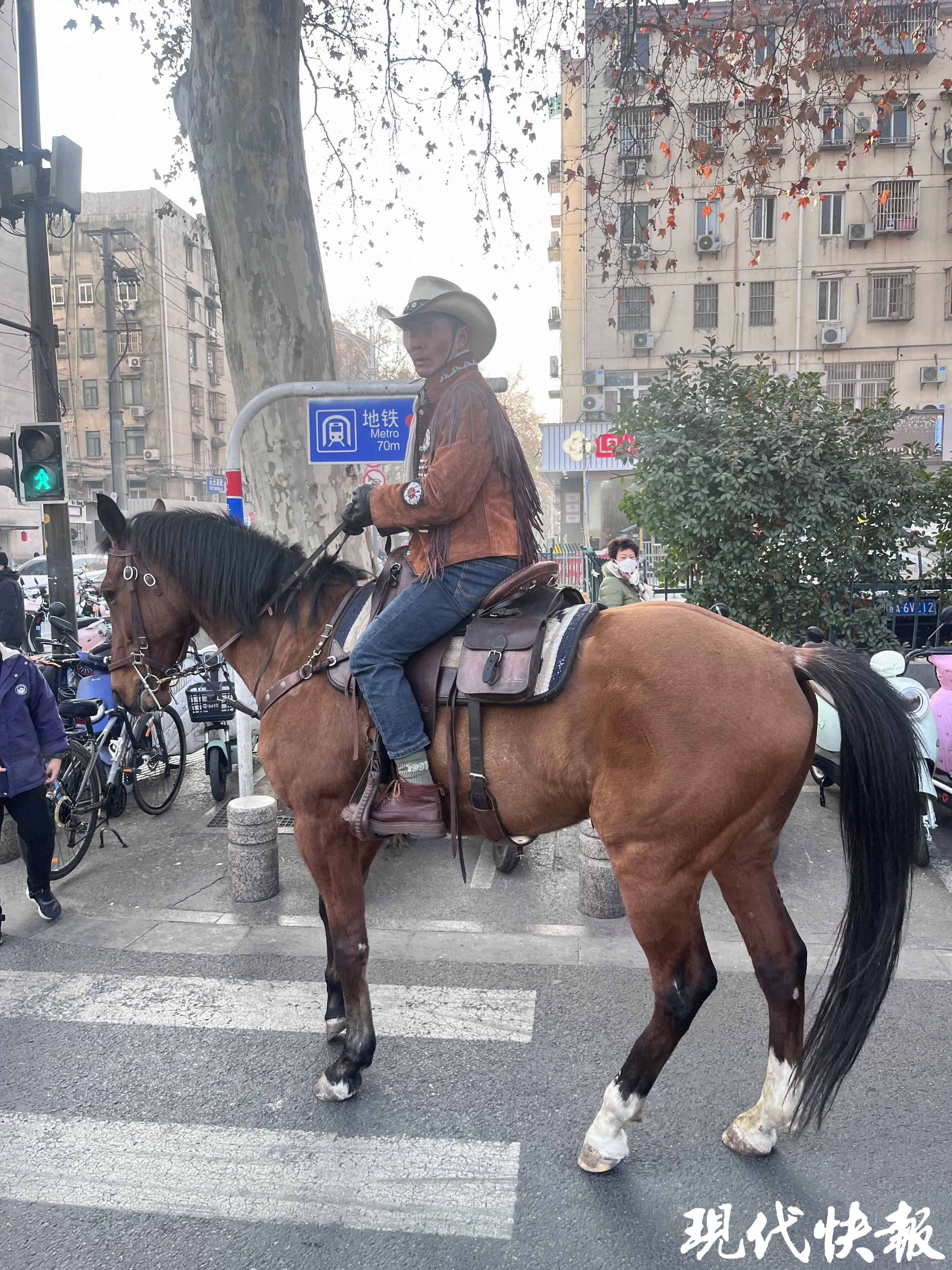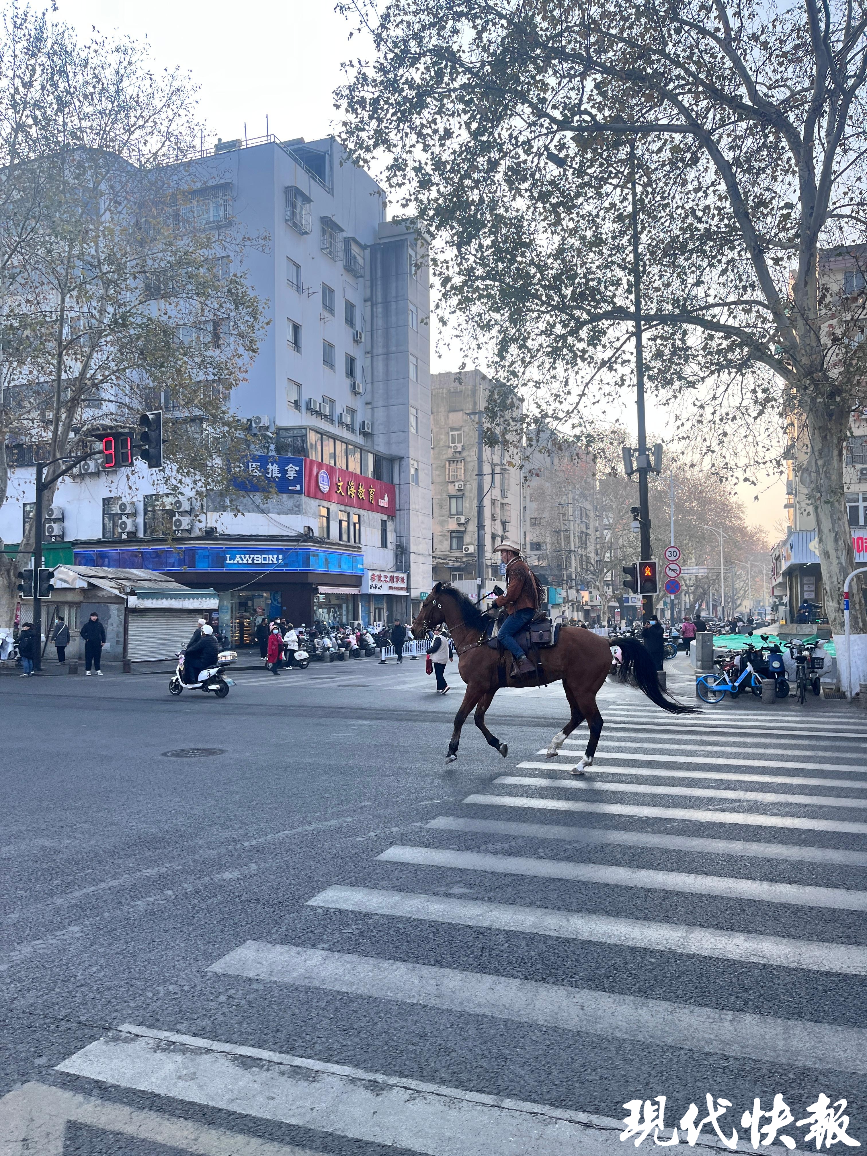 “我是今天早上大约9点钟,在孝陵卫地铁口附近的红绿灯看到的。”拍摄者戚先生告诉现代快报记者,他当时在附近,看到这名男子骑着马从中山门大街由西向东在非机动车道上骑行,感到很好奇,就跟着他拍了几百米。