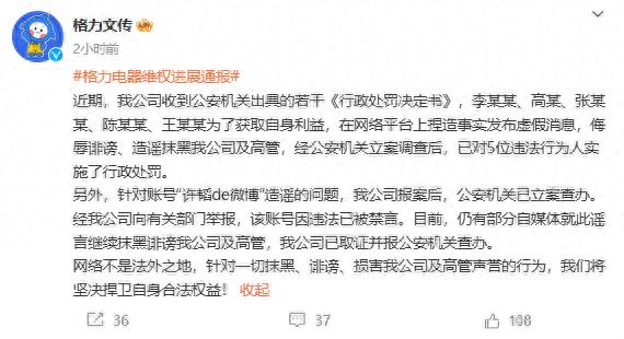 格力文传还称,“针对账号‘许韬de微博’造谣的问题,我公司报案后,公安机关已立案查办。经我公司向有关部门举报,该账号因违法已被禁言。目前,仍有部分自媒体就此谣言继续抹黑诽谤我公司及高管,我公司已取证并报公安机关查办。”