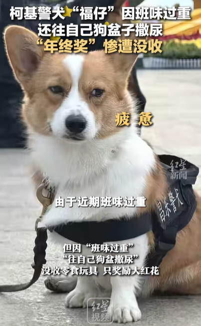 近日,山东潍坊。柯基警犬福仔因2024年表现不错,顺利完成了不少安保任务,为潍坊警犬宣传做出了贡献,被奖励红花一枚,零食罐头玩具若干。