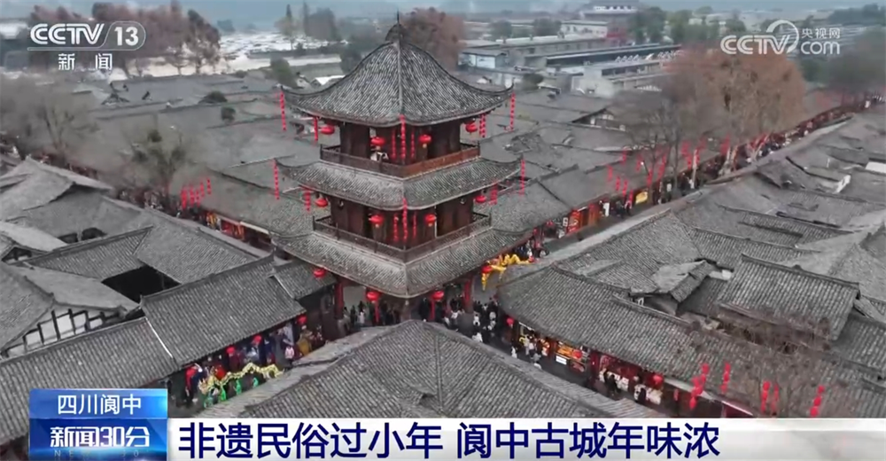 在四川阆中,龙狮巡游、竹马牛灯这些非遗民俗活动都是小年的传统项目。记者在现场看到,古城的正中央中天楼正在进行彩龙舞狮表演。从空中的视角可以看到两条不同的彩色的龙,从古城东西两个方向向古城的中央行进。