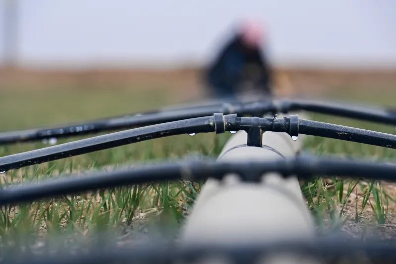 在阿克苏市柳源镇高标准农田,种植户在小麦地里检查滴灌系统(资料图片)。新华社记者 丁磊摄