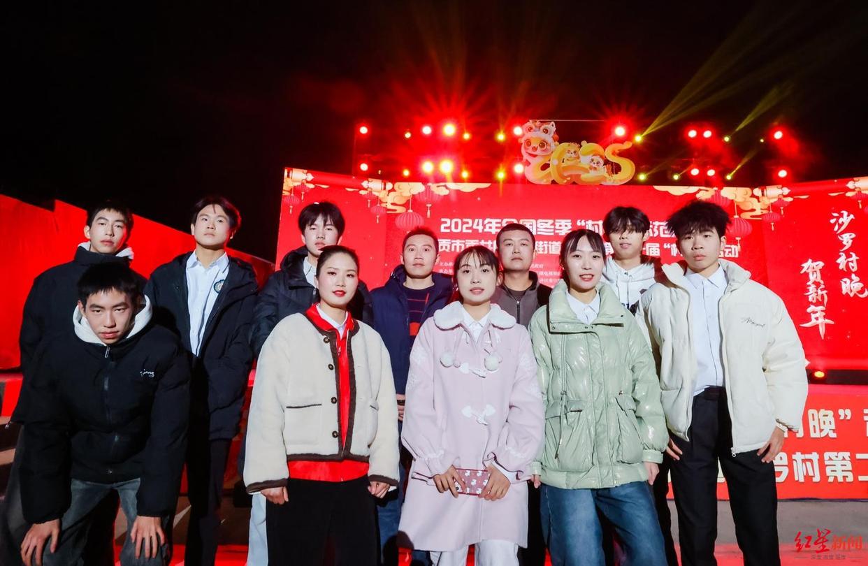 ▲今年“沙罗村晚”现场,创办者谢东春、黄丹等人及同村大学生、中学生合影 红星新闻记者 袁伟 摄