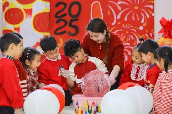 1月22日,在山东省青岛市李沧区世园幼儿园迎新春主题活动中,老师指导小朋友体验创作漂漆灯笼。张鹰/摄(新华社发)
