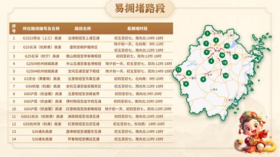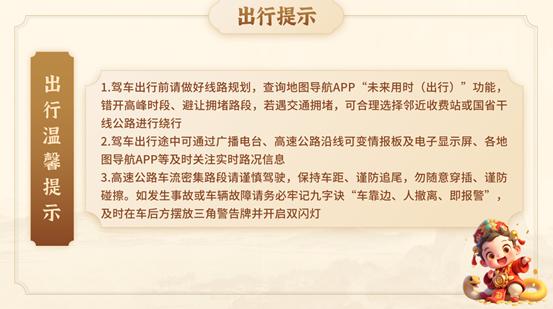 预计春节期间,路网拥堵主要集中于省际通道、大型枢纽、热门景区周边邻近收费站等,出行前请实时关注路况信息,合理选择路线,错峰出行。